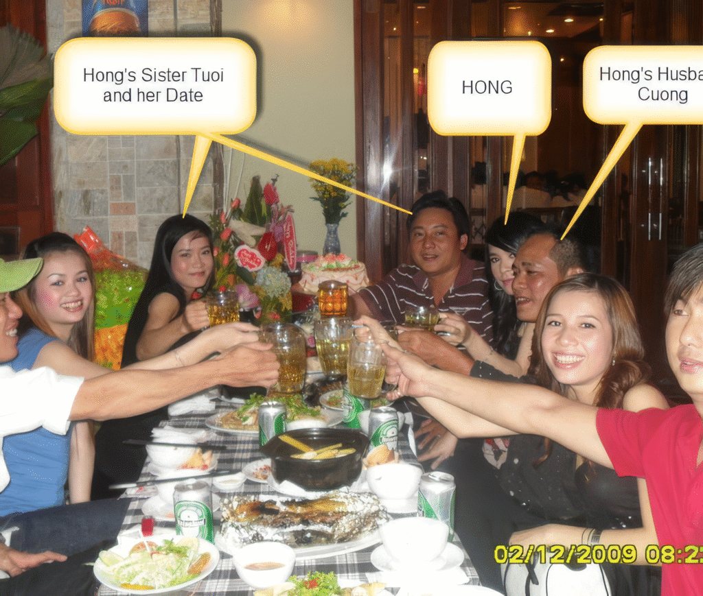 Let’s go back to December 2nd, 2009, when I returned to America. I found the picture below when I ran forensics software on Hong’s hard drive that recovered deleted items. This picture was taken less than 12 hours after I departed Vietnam to go back to America. On December 5th, 2009, my ticket to America was from Hong Kong to Los Angeles, but I stopped in Macau for three days before my flight. As you can see in the picture, Hong (pictured on the right of the picture three seats down from the guy in the red shirt) was out with her husband Cuong, who is sitting to her left. Hong’s sister Tuoi was with the guy sitting next to Hong and is pictured directly across from that guy wearing the brown striped shirt.