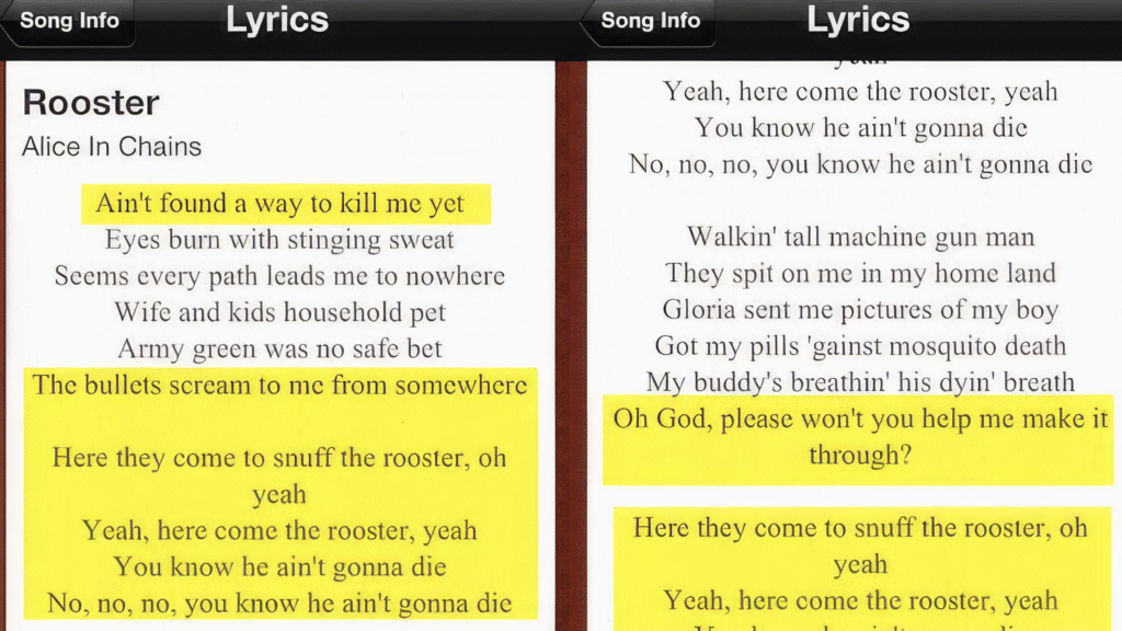 On the 2-hour ride to and from Monkey Island that day, I kept singing the song “Rooster” by the band “Alice in Chains,” but I only knew two verses to the song, and I just kept singing those two verses in a silly loud way, and Hong and I laughed the whole time. I didn’t even hear the song recently, but it popped into my head for some reason. I never even listened to Alice in Chains other than hearing them occasionally on the radio. I didn’t have any of their songs in my 22,000-song iPod either. I never sang a song to Hong for more than 15 seconds the whole time we were together, but this song I sang for at least 90 minutes between the rides there and back. I didn’t even know what the song meant. I thought it was about a real Rooster being slaughtered for dinner; it wasn’t until I had moved back to America in early 2012 that I heard the song and listened to the words and realized it was about an American Soldier in Vietnam. The only song I ever sang to Hong repeatedly was a song about an American nicknamed “the Rooster” surviving his Vietnamese enemies during numerous attempts where they tried to kill him. What are the odds of that? I don’t know even one other song that describes an American surviving over in Vietnam; the odds must be more than a million to 1. I think God planted that in my head as humor! I didn’t realize how meaningful that song was in describing my future until long after leaving Vietnam. The lyrics to the song are below; the real “Rooster” was “Alice in Chains” Band Member Jerry Cantrell’s Father that survived death on many occasions while in the Vietnam War. I highlighted the verses that hit home the most, even though I only knew two verses at the time.