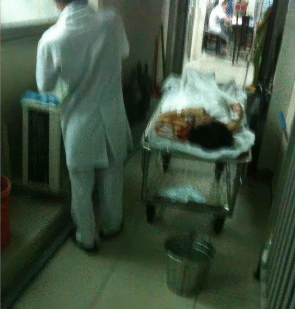 The picture below was the picture I took at the hospital. The hallway she is in has an open wall to the right that is an outside courtyard. They left her in that hallway for three hours until they got a room for her, where she was admitted until the next day when I took her home.
