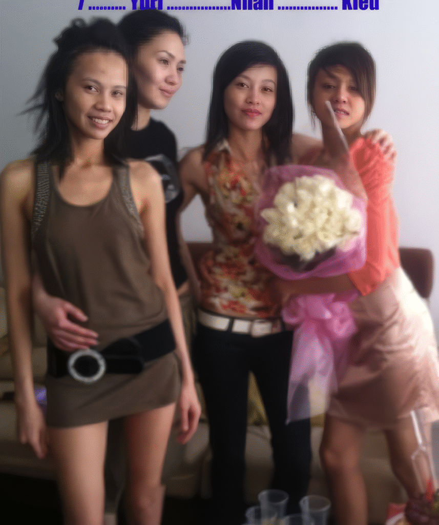 In the image below, Kieu is on the left, and “7” (real name Ngoc My Linh) is on the right. “7” told me that she got the nickname “7” because she ran away from home at 11 years old and didn’t return until “7” years later when she was 18. Hong said that wasn’t true and that “7” had to go make money for the family and that she didn’t leave until 14. 7’s mother seemed to be very sweet, but their father was evil; I remember one time I went to their parents’ house and “7” started crying and screaming out of nowhere, and her father kept saying “Du Me” which means “Fuck your mother” in Vietnamese. The reason “7” cried was that she just found out that her father stole $5,000 U.S. that was meant to buy property for “7” and “7” gave the money to her mother to hold a few months prior, but her father forced the mother to give it to him, and he blew the money on his mistress and gambling. 7’s father used to rape her older sister Nhan when they were younger.