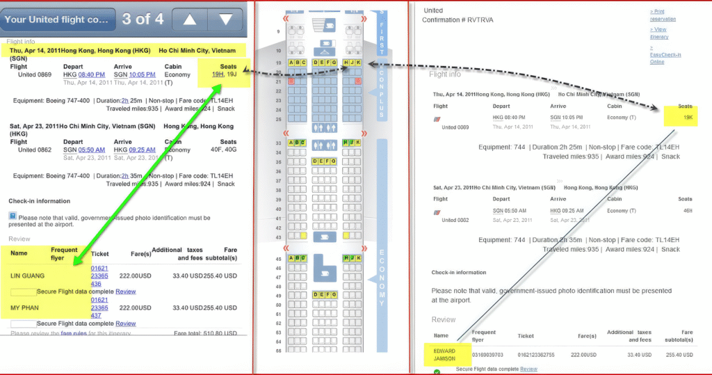 Below is a picture of the receipts for United Flight 0869 on April 14th, 2011, that I purchased for John (Real name Guang C Lin) & his Wife “7” (real name My Phan) & myself, along with a seating chart that shows you how we were seated together. The Triads needed to make sure they had their people sitting next to me to forward the scam. Hence, they had John and “7” act like they wanted to fly with me to keep those two seats open to allow their conspirators to sit there who were ticketed with different seats since the ones next to me were reserved for me John and “7”.