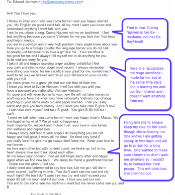 This email in the picture above was sent to me by Hong while I was in Macau 2 days before the Airplane Scam, which was also the same time she was sending a celebration message to her friend 7 thinking I was going to prison forever, which I discovered two days after escaping the Airplane Plot. Hong sent this to me after telling me on the phone that she was leaving my son and me forever to join a monastery to help disabled people. She never even brought up the fact of ever leaving me and always thanked me for how I helped her whole family. This was the first time Hong said this to me and was done in preparation for me getting arrested, to have one less thing to deal with when that happened. I think it was also done to make sure I was visibly upset on the Airplane on my return two days later, or maybe she hoped I would change my flight to come back to help me since the scammers were already set to go on April 14th, 2011. I would assume that she tried to help me except for the message I discovered two days after the Airplane where she said “Cheers” in Vietnamese to “7”, which obviously would have been in celebration of my downfall. Still, she never hit send, and it remained in the outbox, so I don’t know what to think as to if she was happy or sad about it.